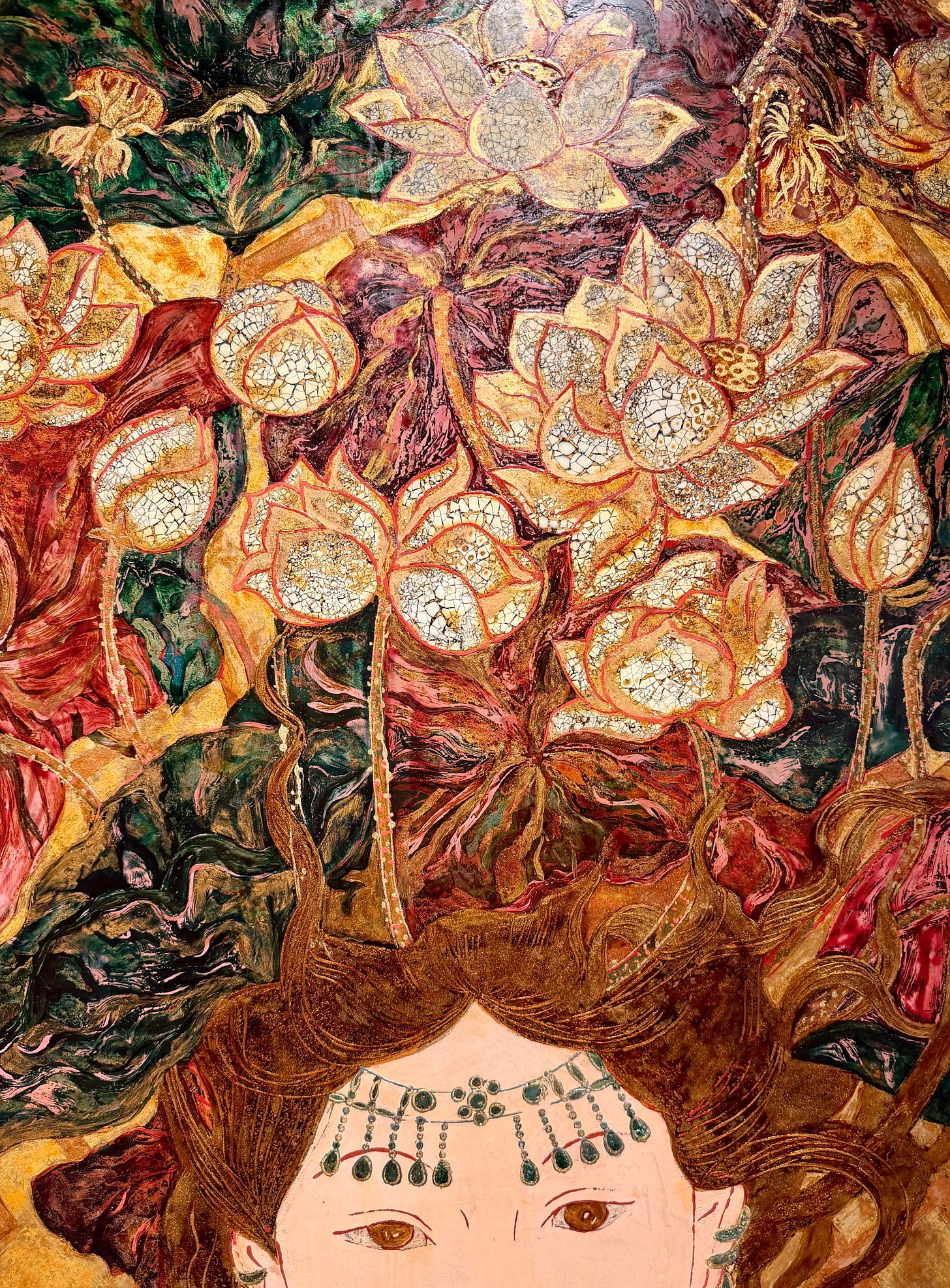 se você der um zoom na imagem acima, vai ver que as flores são craqueladas, essa é uma tecnica tradicional vietnamita conhecida como Cẩn trứng (incrustação de ovo), que é parte fundamental da arte de laca mais ampla, o Sơn mài. o efeito fica muito interessante. (link)